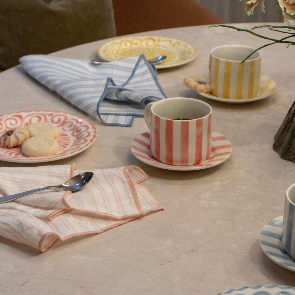 Velg mellom stripete linservietter i fargene White/Yellow, White/Dusty Pink, White/Blue og White/Sage Green. Eller mix & match for en borddekking med ekstra personlighet.