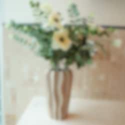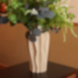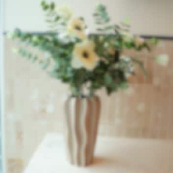 Den matte finishen og det myke bølgemønsteret gir vasen et rolig, men levende uttrykk som føles like riktig i stuen som på soverommet eller på et sidebord i gangen. Størrelsen er generøs og perfekt for større buketter, noen kvister, tørkede strå eller bare et par snittblomster når det skal være enkelt.