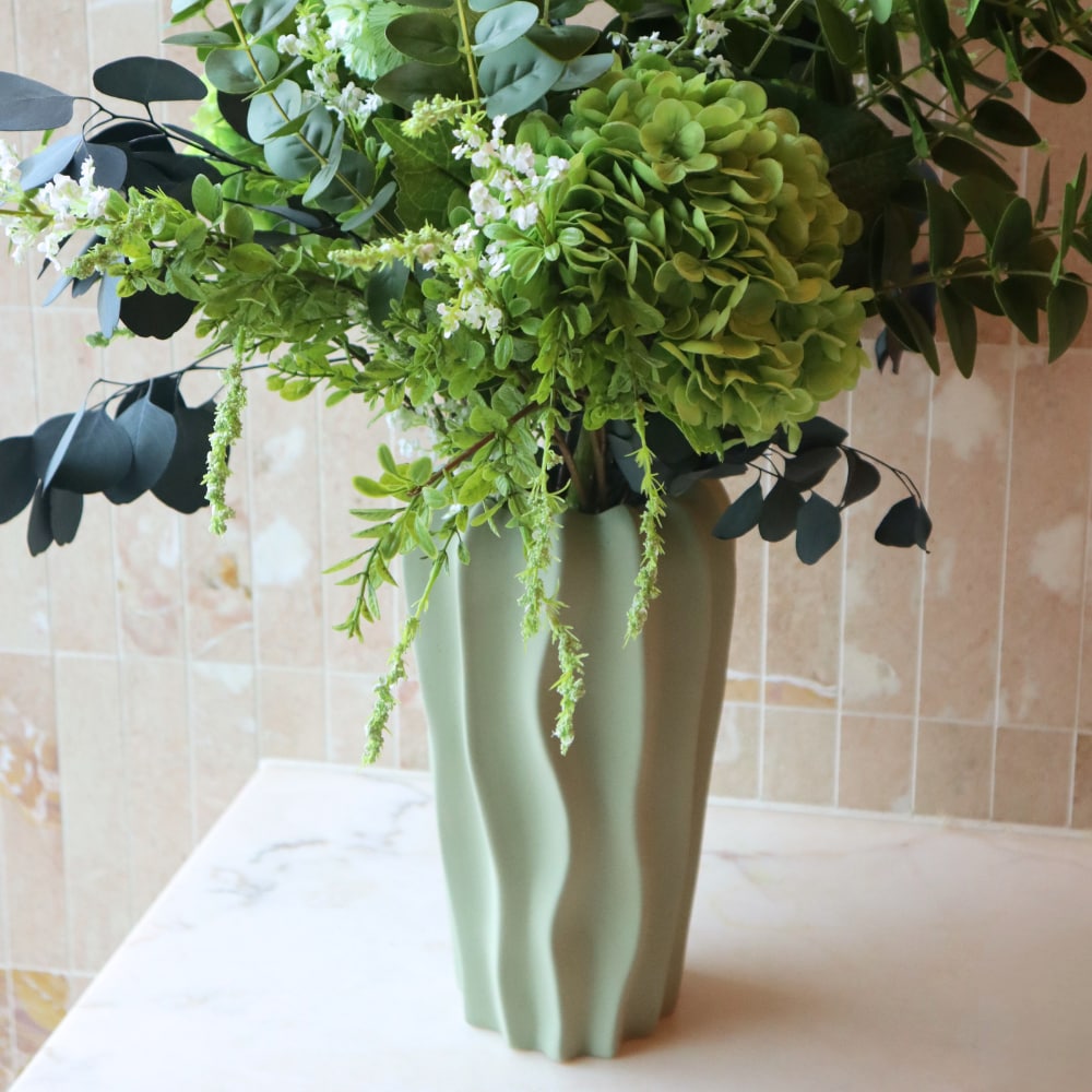 Den matte finishen og det myke bølgemønsteret gir vasen et rolig, men levende uttrykk som føles like riktig i stuen som på soverommet eller på et sidebord i gangen. Størrelsen er generøs og perfekt for større buketter, noen kvister, tørkede strå eller bare et par snittblomster når det skal være enkelt.