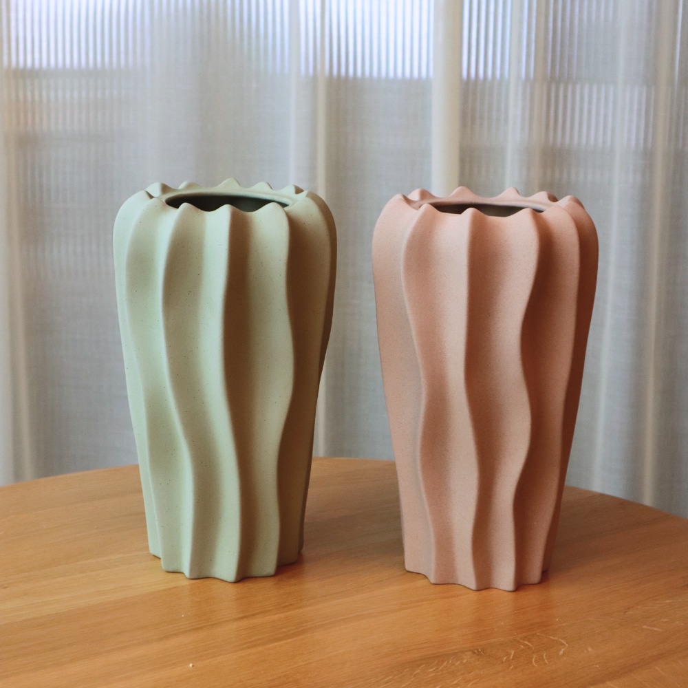 Vasen Drift finnes i beige og grønn – to tidløse farger som er enkle å kombinere med både lyse og mørkere interiører. En keramisk vase som fungerer året rundt og holder stilen, også når den står tom.
