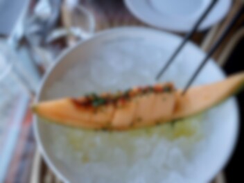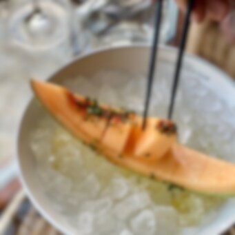 Skär melonen i bite-size, drizzla olivolja och lime juice. En liten pinch av espelette, gräslök och sea salt. And voila - du har en drömmig nibble by the pool.