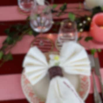 Det trengs ikke mer enn vakkert brettede linservietter for å skape et wow-øyeblikk ved bordet. Match med håndmalte tallerkener og serviettringer i rotting.