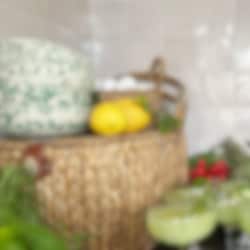 The collection includes hand-painted porcelain items such as plates, pizza plates, bowls, and mugs in stripes and splashes of color and lively hues like lemon yellow, raspberry pink, lovely blue, green pistage, and sage green. Perfect for elevating your table setting, both for everyday and special occasions!