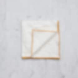 The Meadow Linen collection includes linen tablecloths and kitchen towels in beige and white, as well as white linen napkins with colorful edges.