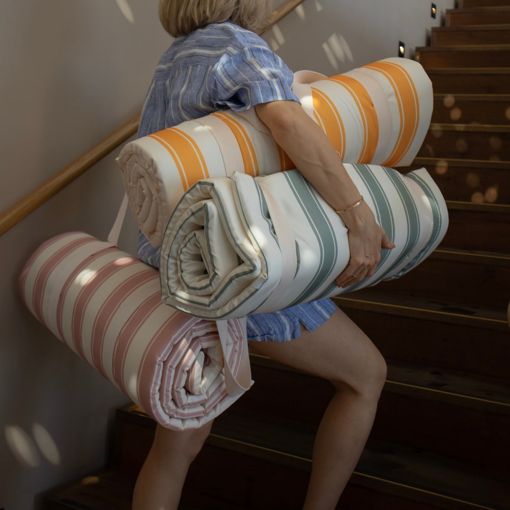 I år er den dessuten laget i 100% polyester, noe som gjør den ekstra slitesterk for strandliv og poolheng. Den kan enkelt rulles sammen for praktisk oppbevaring eller tas under armen til neste stranddag. Perfekt når du vil sette deg ned, lene deg tilbake og nyte solen – uansett hvor du er.