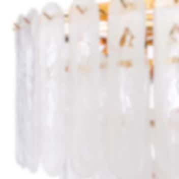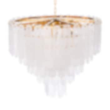 The Riveria Chandelier from Eichholtz is a stunning light fixture that channels glamorous Art Deco style into your home. This vintage-inspired replica with a gold finish exudes a lively atmosphere inspired by the roaring 1920s. The multiple tapered levels of frosted glass create captivating lighting that illuminates the room with elegance.