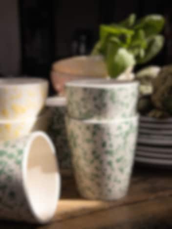 En medelhavsinspirerad porslinsserie som förvandlar varje måltid till en visuell fest. Handmålade tallrikar, skålar och serveringsfat i livliga nyanser av citrongult, himmelsrosa och salviagrönt ger ditt bord en känsla av ett dukat bord vid Medelhavet.