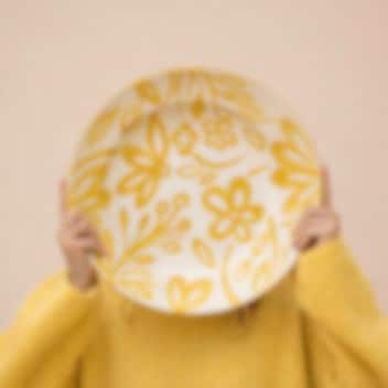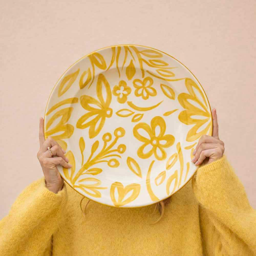 Med sina vackra, handmålade blommor i gult/mustard, rosa eller grönt blir detta fat ett riktigt blickfång. Det är rustikt och charmigt, perfekt för servering eller som ett konstnärligt inslag i köket.