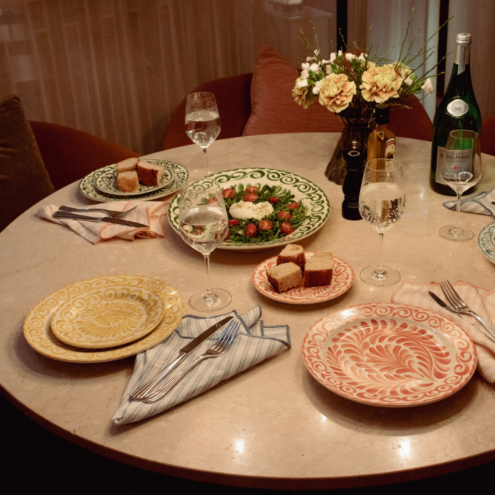 Inspirerad av Italien där vardag och fest flyter ihop, där kaffet dricks långsamt och middagen får ta tid. Med sina rustika former och lekfulla färger är Ciao Bella-tallriken gjord för allt från enkla vardagsrätter till middagar – alltid med en varm och inbjudande känsla.
