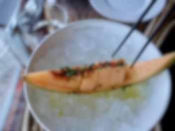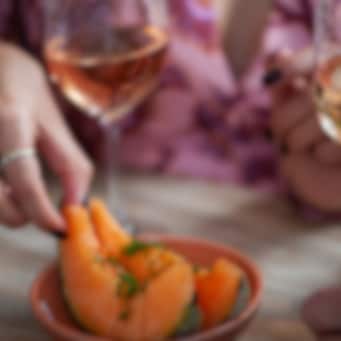 Skär melonen i bite-size, drizzla olivolja och lime juice. En liten pinch av espelette, gräslök och sea salt. And voila - du har en drömmig nibble by the pool.