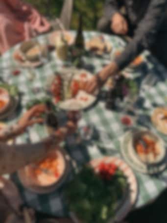 Med La Bella Tavola som huvudrollsinnehavare skapar Elin en atmosfär som fångar sommarens essens och den glädje vi känner när vi äntligen kan njuta av en lunch utomhus, omgiven av natur, blommande träd och växter. Bruschetta, krämig burrata, pasta och kylt vin – allt serveras på solstänkt porslin och skira glas på en bas av linne, rutor och volanger. Och förstås, sällskapet av ett gäng härliga lunchgäster!