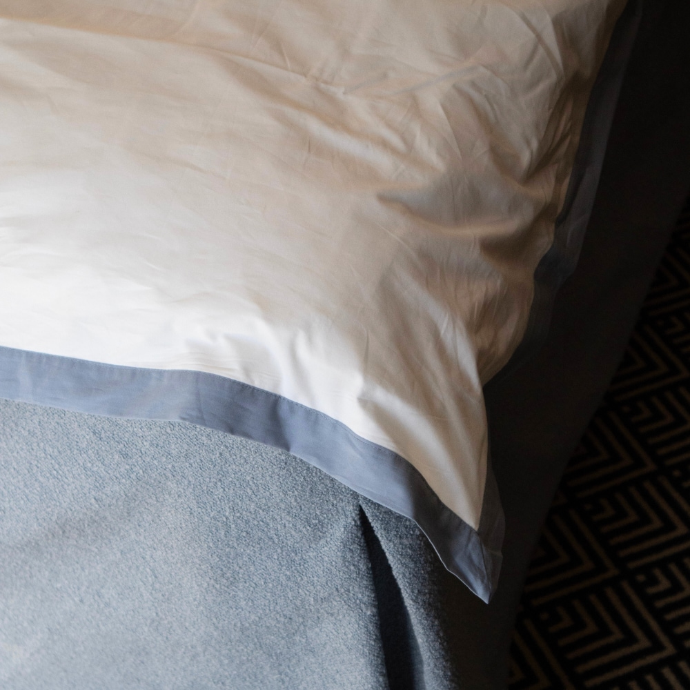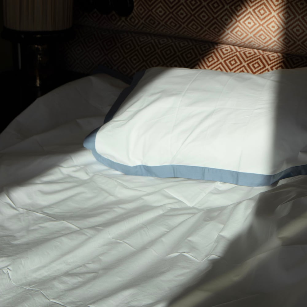 Krispig vit bomull möter en stilren kontrastkant som ramar in sängen och ger en avslappnad boutique hotel-känsla. En enkel detalj som gör bäddningen lite mer genomtänkt och sovrummet lite mer fancy. Maverick finns i två varianter – vitt med blå kant och vitt med beige kant. Två tidlösa färger som passar lika fint i ett lugnt sovrum som i en mer hotellinspirerad stil.
